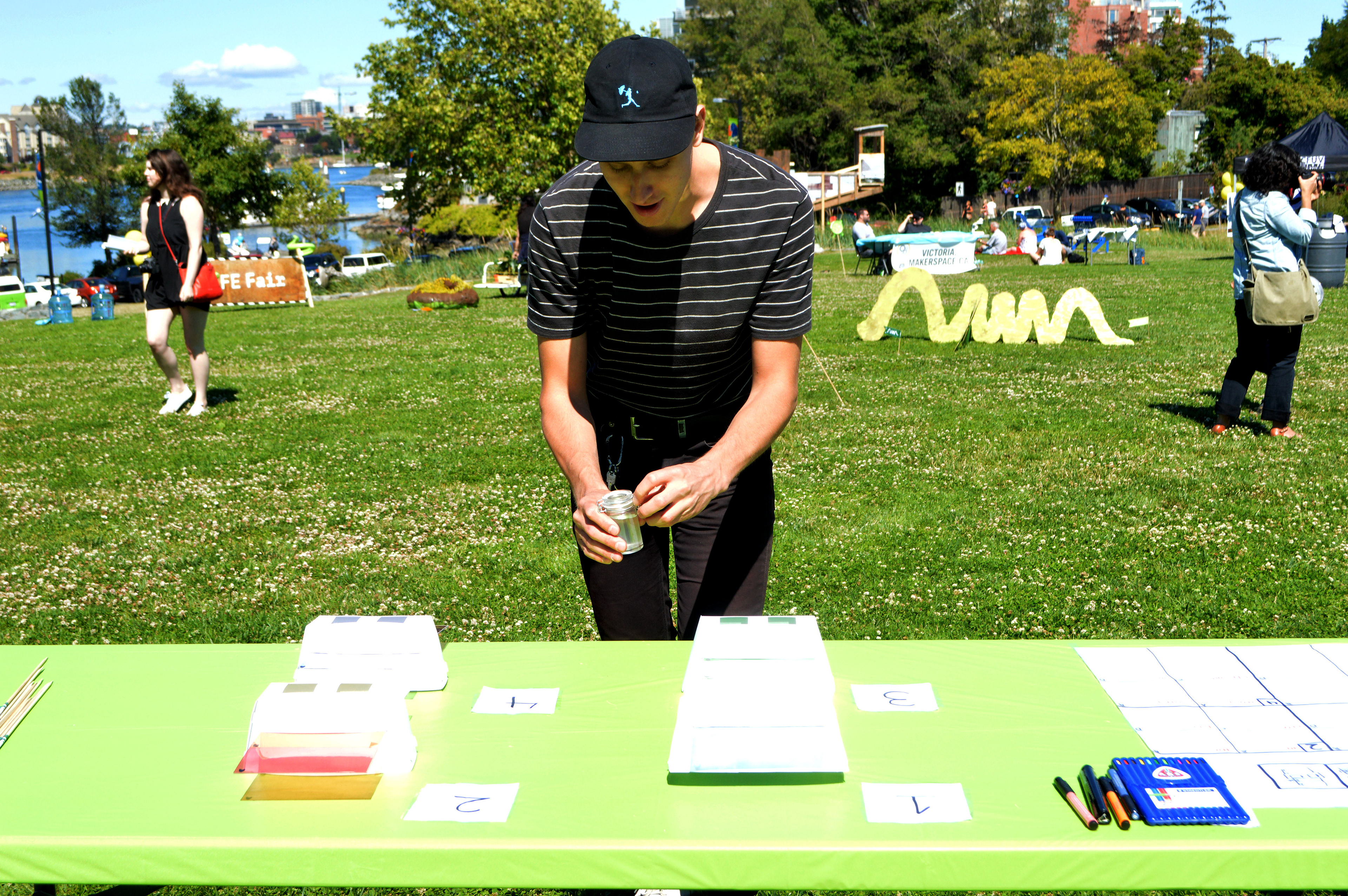 A smell experiment conducted in a public setting. Participants were given the task of deciding which predetermined color best described the smell they were given. The colors were chosen from individual descriptions of memories described in previous interviews. A record of the results was kept and displayed over they course of the experiment, something that unexpectedly influenced individual choices. While offering a choice of colors influenced participants decisions the desire to be unique was surprisingly highly persuasive.